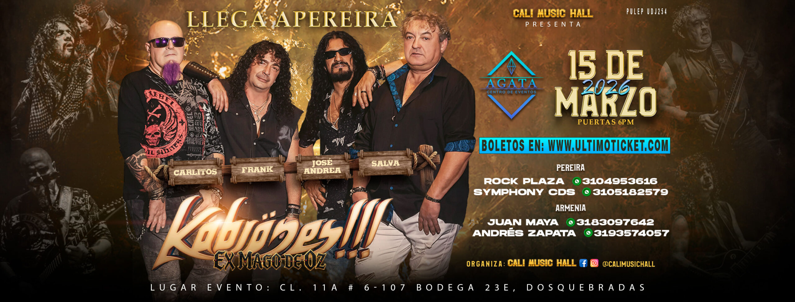 La banda de exmiembros y músicos pioneros de Mago de Oz en su época dorada. Kabrones llega a PEREIRA para hacer temblar el escenario con su inconfundible sonido. Un show lleno de clásicos y toda la potencia de esas canciones que marcaron generaciones como «Fiesta pagana», «Hasta que el cuerpo aguante», «Molinos de viento», «La costa del silencio», «Pensando en tí», entre otras. Por fin esta alineación se une para reencontrarse con el público del Eje Cafetero después de muchos años de ausencia. Kabrones ha realizado ya varias giras por Latinoamérica con total éxito. Inclusive en algunas ciudades de Colombia como Bogotá, Pasto, Cali y Medellín. Te esperamos y no te pierdas de esta fiesta!